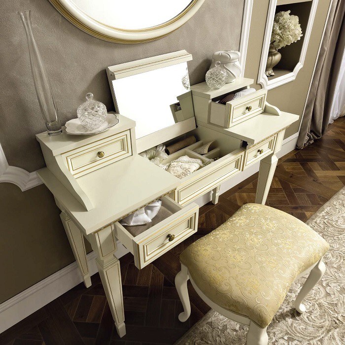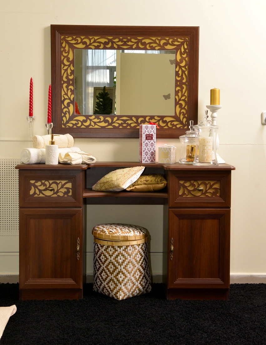 Качество исполнения и оформления, стоимость и срок службы туалетного столика для спальни во многом зависят от используемых материалов. Широко используется: