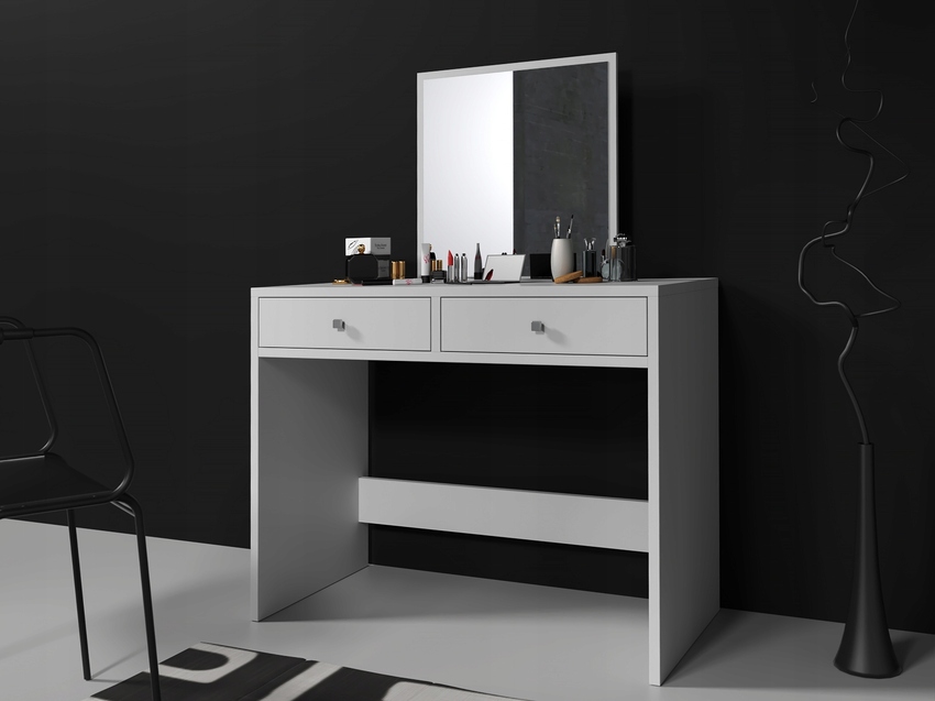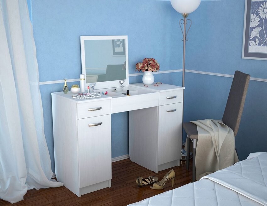 Сам туалетный столик имеет относительно небольшие размеры, зато позволяет оценить созданный образ, а не только качество макияжа или прически. Имеющиеся отсеки подходят для хранения небольших косметических средств.