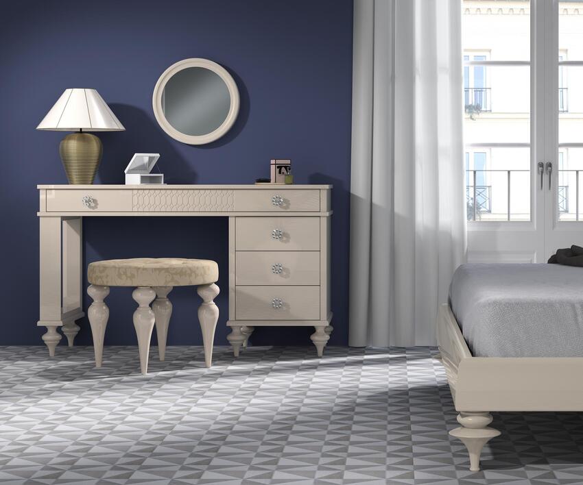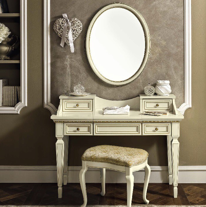 Цветовая гамма преимущественно в светлых тонах. Выбирают белый, жемчужный или цвет слоновой кости. Ножки делают изогнутой формы, украшая серебряным или золотым напылением. Зеркало помещают в резную раму.